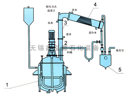 1、反應(yīng)鍋 2、豎式分餾柱 3、豎式冷凝器 4、臥式冷凝器 5、貯水器